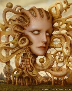 He makes swirling amalgams of humans, animals, aliens, dolls, plants…intertwining like a grand mad scientist DNA experiment.