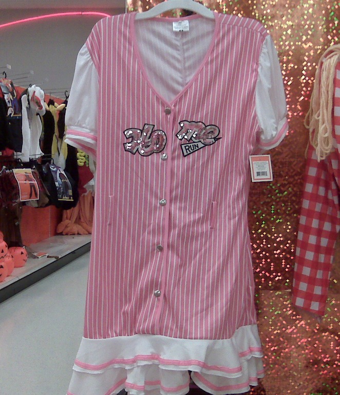 This is either a female baseball player outfit or a cheerleader costume, with the worst letter spacing I’ve ever seen. I’m sure “adult” costumes are full of bad puns, but come on…Target is a family store.