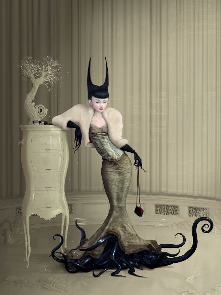 His work remains in a lushly colored dreamscape somewhere between past and future, filled with female chimeras.