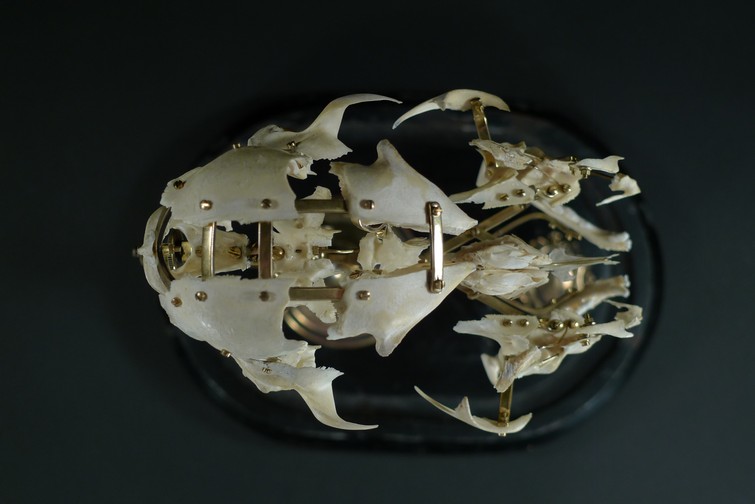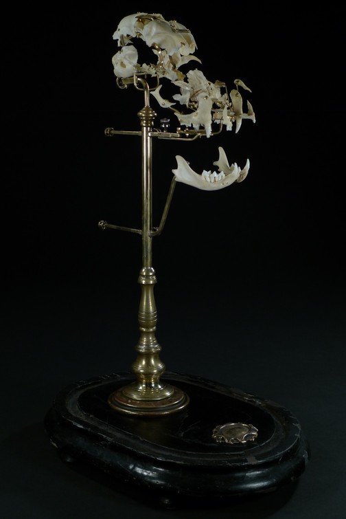Believe it or not, there is no bone cutting involved in this process. The skull is fully disarticulated, using a method of internal expansion. The adjustable metal fixtures are handmade as well.