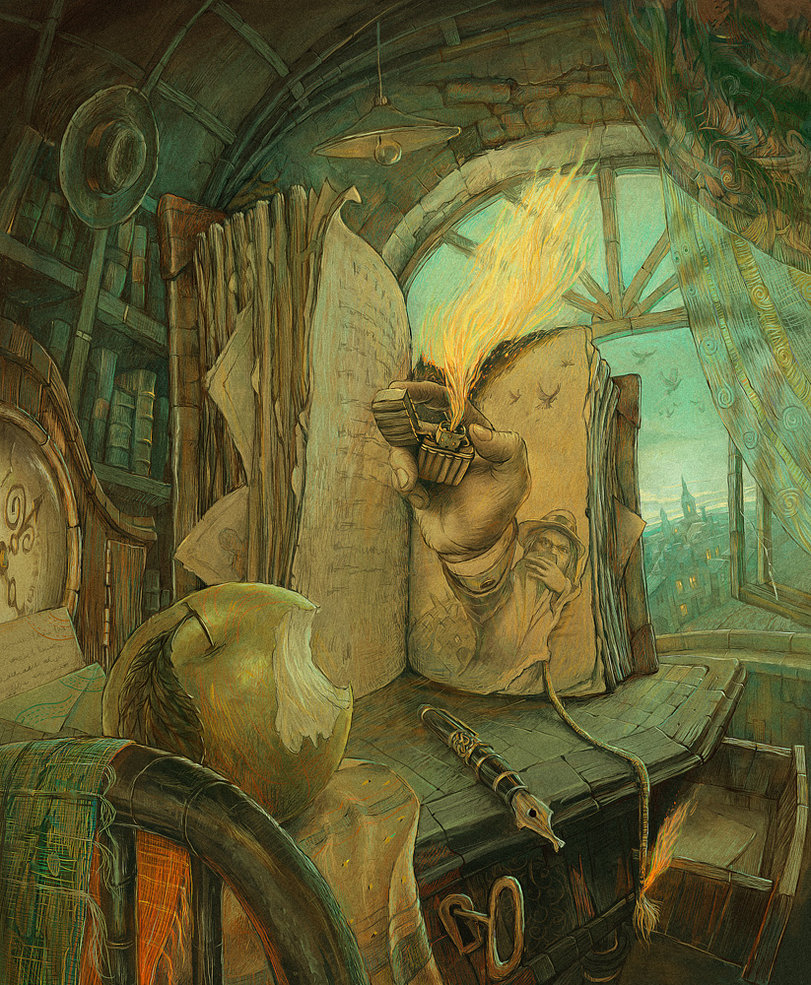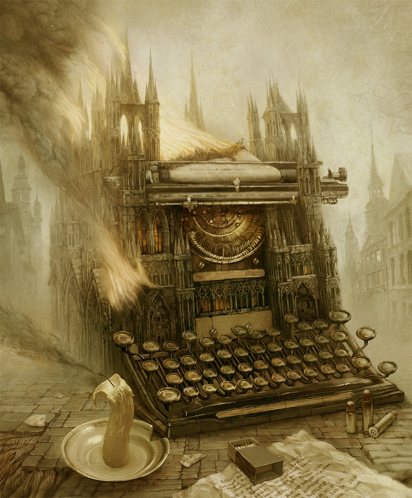 1. Absolutely astonishing work, including his other works on his website. Color tones are exceptional. Now this is an artist I admit defines digital artistry and is a muse to bank my imaginative cache. Yes, the first two are indeed really spectacular. I love all the imagery: a gothic-cathedral-vintage-typewriter, and I seriously want a gothic-castle-tree-candelabra piano, for real, just like that. And then my favorite is the secret library clock. Stately library dens, books and grandfather clocks I have a penchant for that roots to my soul. So cool to have a secret door like that; perhaps one day I can do that for real. I love that bumper sticker idea, Dana. And then on a another sticker say, BACKUP TRANSPORTATION WHEN MY TARDIS IS IN THE SHOP.