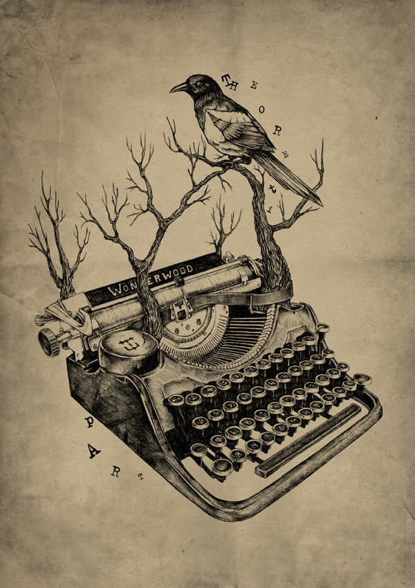 The tiny winged skeleton faeries, way too cool, especially the one riding the blue cardinal, I think, unless it’s bird of another feather. Not a blue jay I know that. ( Who cares Eric, it’s not important ! ) Certainly yes, the antiquated typewriters; something about them so prolific, how just an image still manages to type out thoughts and memories.