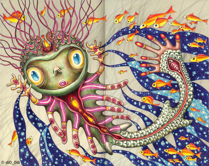 All dib0_0ib work seems to be done on sketchbook pages. This is some pretty intense sketching, filled with bizarre creatures from alien world’s (and some interesting variations on creatures from our own).