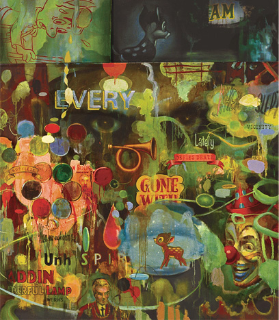My love of strange art is most likely why I have absolutely no need for drugs. Dan Kennedy sends me on an “art trip” with his tightly packed brightly colored amalgams of pop culture.