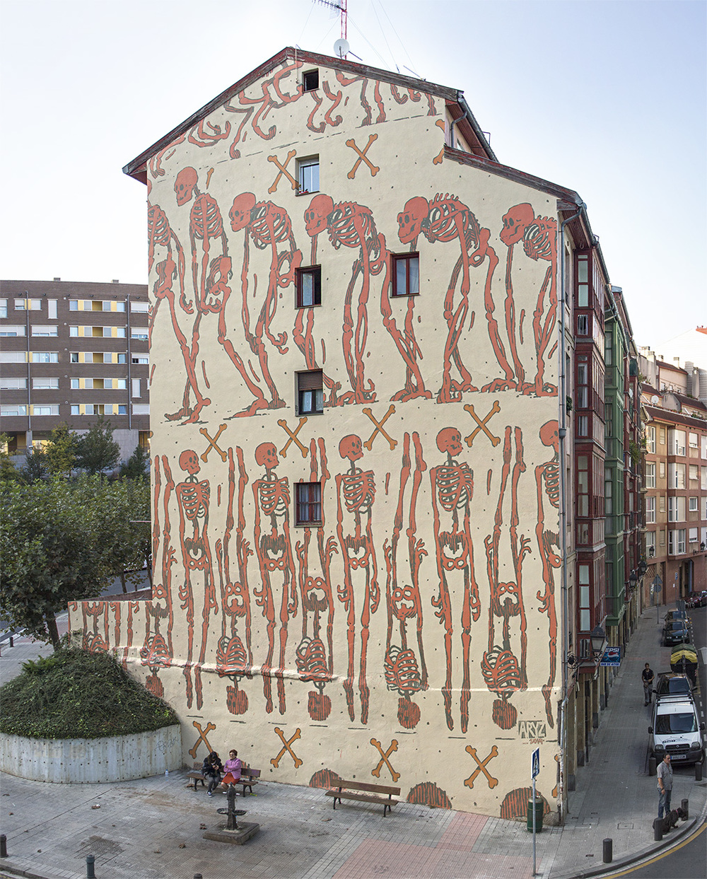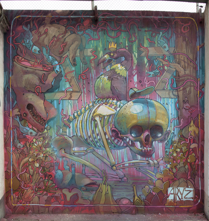 He paints giant murals, often on the sides of abandoned factories where he can have time to work undisturbed. Despite the high volume of skeletons and the innards of various creatures, his work has a kind of sweetness to it at times.