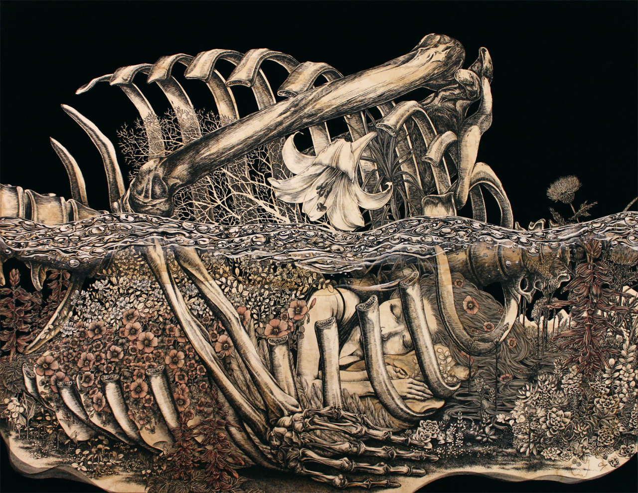 Much of her older work was inspired by Eastern religion, myth and philosophy. Clearly influenced by nature and the beautiful structure within the ephemeral cycles of life and death, her newer works delve into alchemical and sacred geometry.