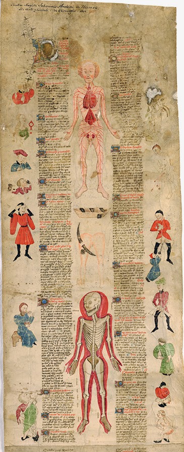 Morbid Anatomy has a fascinating post on De Arte Phisicali et de Cirurgica (The Art of the Physician and the Surgeon), an illuminated vellum scroll, 542 cm (17 feet 9 inches) by 36 cm (1 foot 2 inches). It is dated 1412 and resides in the National Library of Sweden.