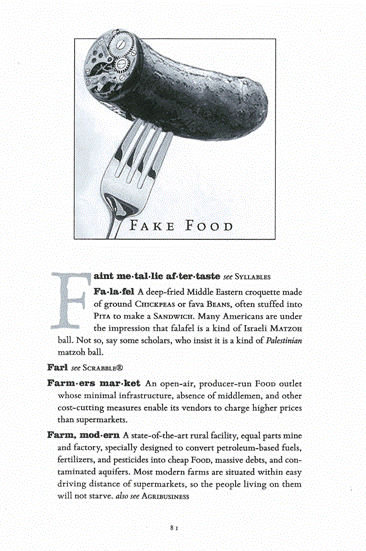 I just found one type of satire I don’t yet own: food commentary. I’m eager to get a copy of The Devil’s Food Dictionary and feast my eyes (oooh…pun intended) on its vast array of fabricated entries.