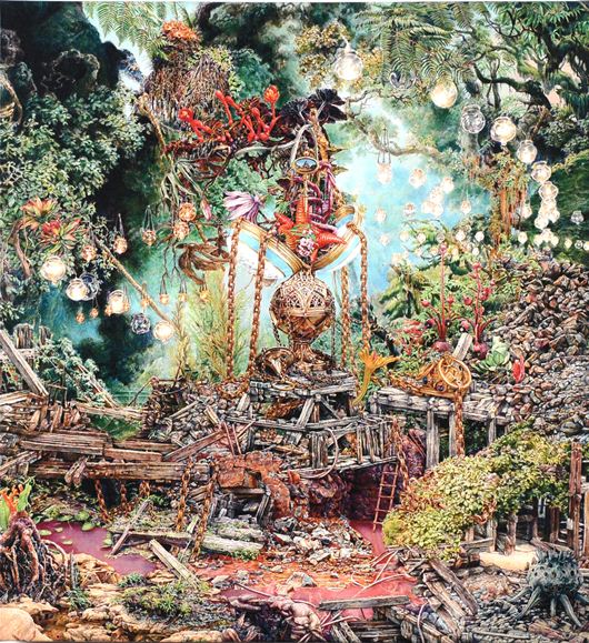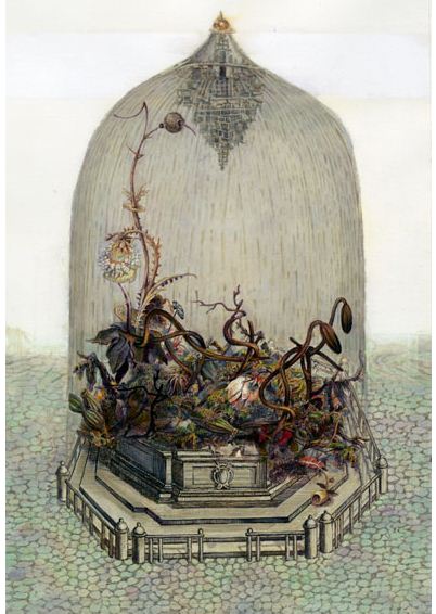 Blatt’s intricate watercolor paintings focus on enclosures set into abandoned piazzas, rigorously rendered with twisting, virtuosic detail. Outcropping bell jars, fountains, terrariums, monuments, and medallions serve as incubators for lush, botanical worlds in which the artist cultivates a psycho-suggestive bounty.