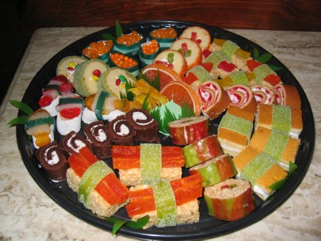 I’m not sure if sushi maintains its status as the ultra chic cultural phenomenon it once was…but I personally don’t like it, and don’t mind if that makes me uncool. I will, however, eat any number of bastardized sushi-styled delicacies like this wonderful cake I saw on flickr:
