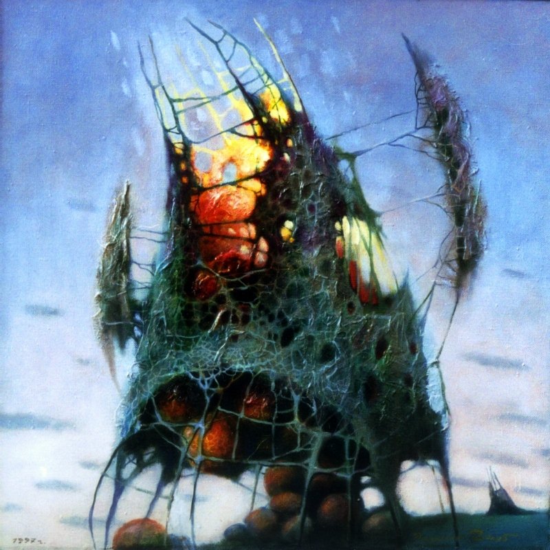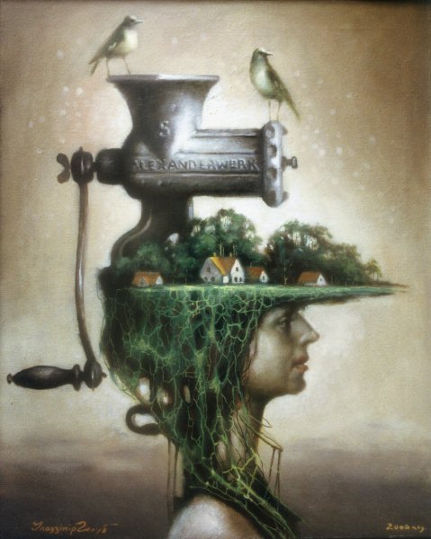 Her ethereal worlds often involve strange apparatuses of questionable purpose. Tiny animals, string…perhaps not meant to tell a cohesive story.