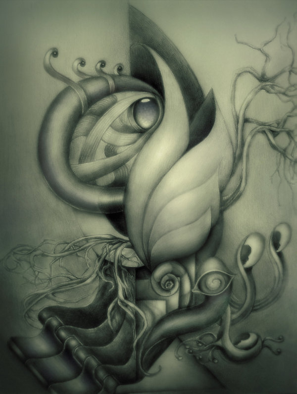 His work reminds me a bit of Jacek Yerka with its fine details and blending of architecture, human invention and nature.