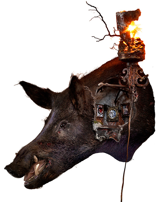 Her work is primarily made from old taxidermy and almost all recycled material. Almost all of her pieces share the concept of small worlds and dioramas situated in objects. She gathers inspiration from antique fairy tale illustrations, amusement parks and artists like Bosch and Joe Coleman.