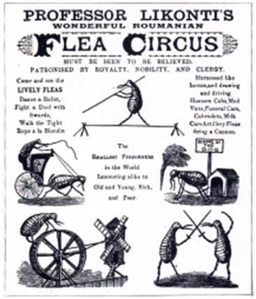 So we have to call in professionals today. While they work, feast your eyes on some vintage flea circus images (if ONLY these little buggers could be even mildly entertaining in this house…instead of the pestilent spawn of Hell they’ve proven to be).