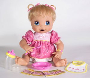 On a related note, I came across this commercial for Baby Laugh-a-Lot, whose frozen open mouthed grin and maniacal cackle put Talking Tina and Baby Alive to shame. Even the children in the ad look shocked and miserable as they whip their head around to see where the awful racket is coming from.