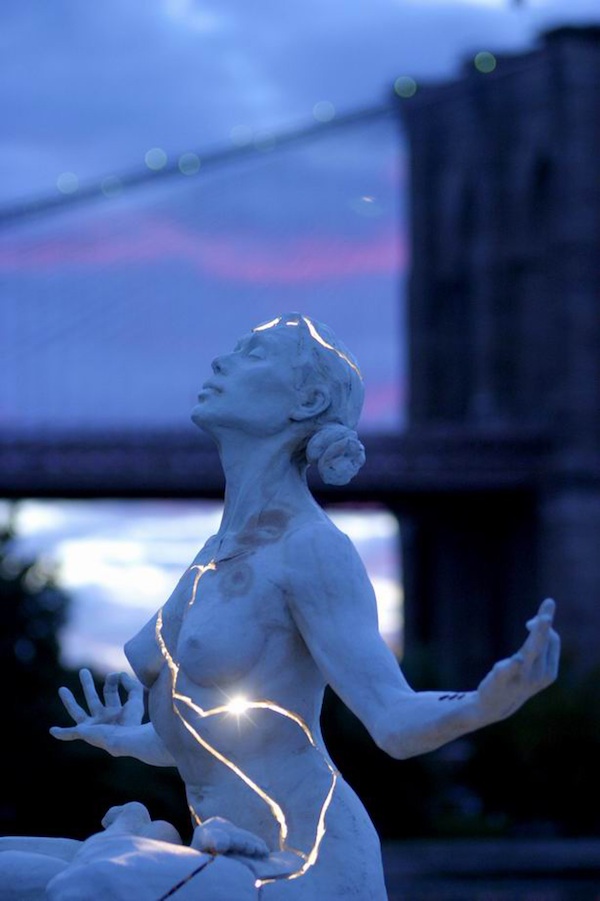 This piece contains such harmony of design, medium and message. It is a woman meditating in lotus position. Realizing that fine-tuned figure work had lost its sway in the art world in recent years, Bradley literally LET GO of the piece, willingly allowing it shatter. She then cast it in bronze and arranged for the inner lighting fixtures.