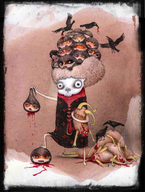 I’m absolutely captivated by this Marta Adan piece; the glowing pink palette, the delicate beauty mixed with the raw presence of bone. The alchemical symbol for antimony (which represents the wild, animal spirit within man) graces her forehead. What a way to elevate a color so often associated with childish or hyper-feminized images.