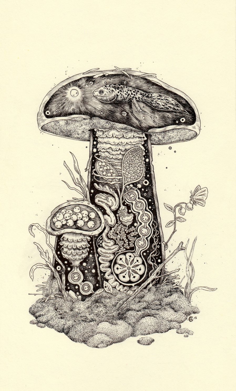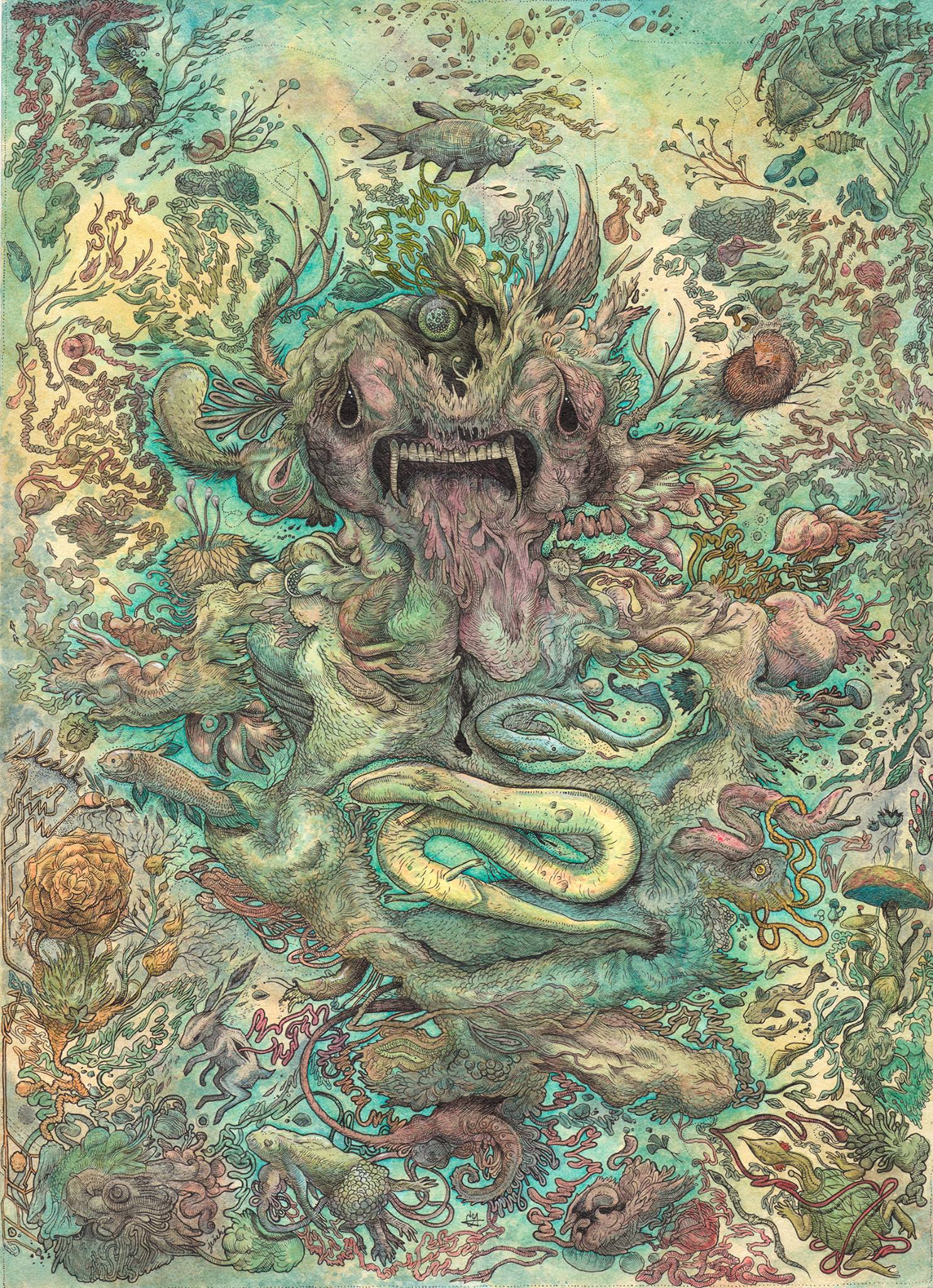 His sources range from vintage pulp art to fine art, and everything in between. Biology textbooks, nature picture books, the art of folklore and Americana…