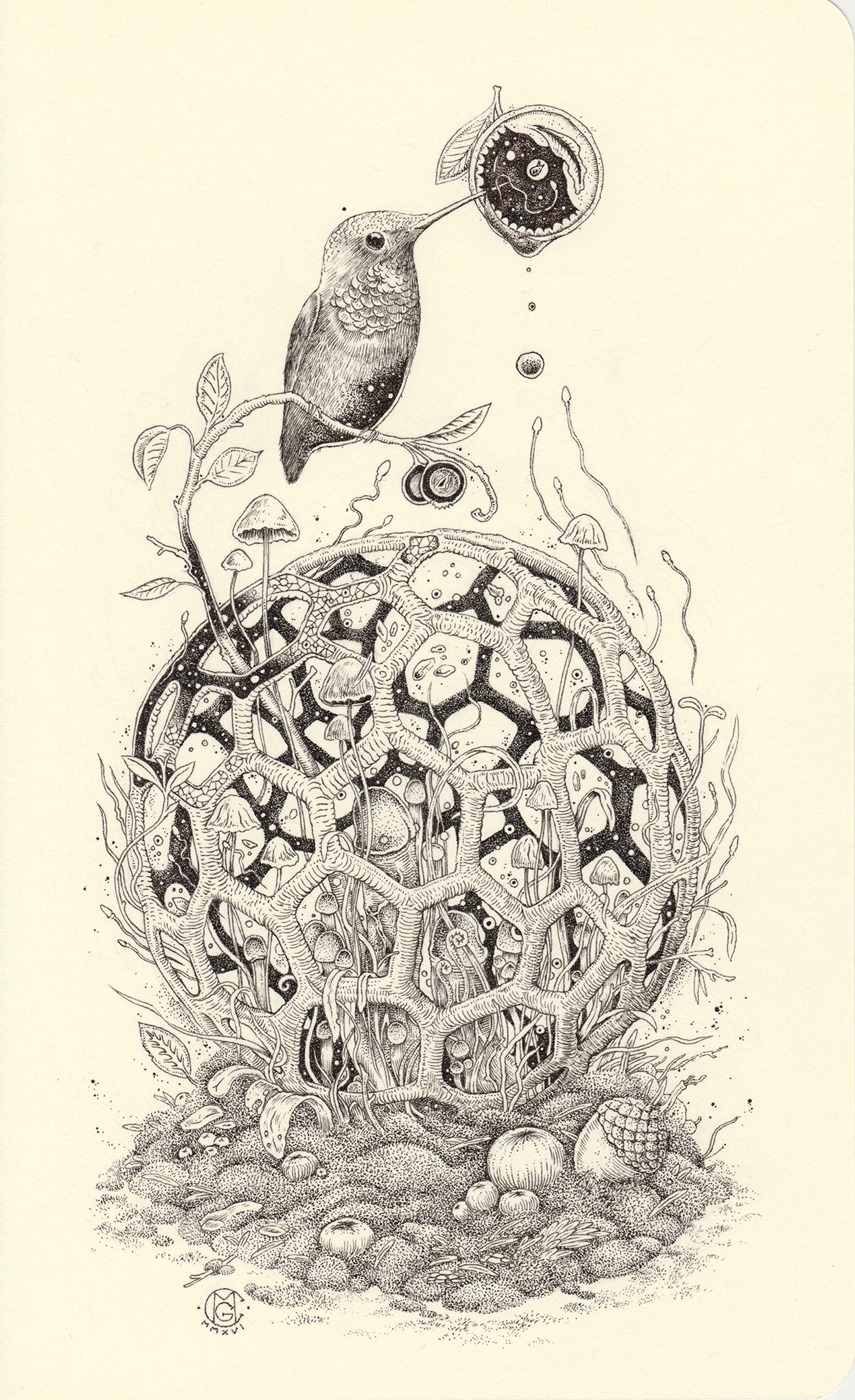Much of her older work was inspired by Eastern religion, myth and philosophy. Clearly influenced by nature and the beautiful structure within the ephemeral cycles of life and death, her newer works delve into alchemical and sacred geometry.