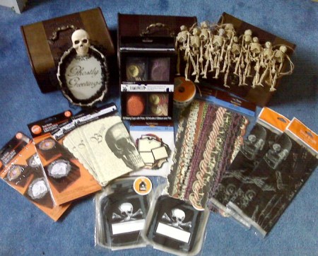 Those antique style boxes in the background are perfect for vampire hunting kits! The skull treat bags, cupcake decorating kit, boxes, ribbon, tags and decorative textured border tape were all on clearance already! Believe me, I used utmost restraint because there was so much more I could have splurged on for great prices.