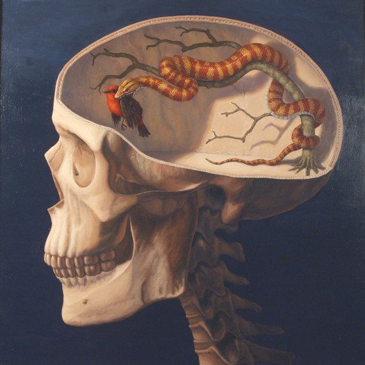 Contemporary culture, human folly and an obsessive curiosity for the macabre provide the fuel for my subject matter. My work is inspired by the natural sciences as well as by the classical drawing techniques of the old masters, including anatomical studies by artists such as Andreas Vesalius and Bernhard Siegfried Albinus. My recent paintings incorporate anatomical imagery to explore the human psychological condition, such as cutaway skulls portraying our basic human drives and the thin veneer of humanity overlaying our animal nature.