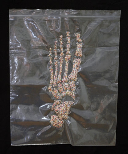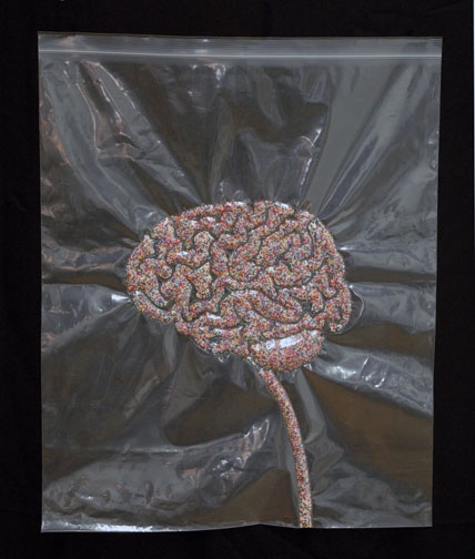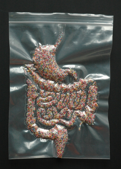 Heather Cox is a fantastically innovative artist and sculptor. I’ve been marveling at her Nonpareil Project, which features shapes sewn into plastic bags and filled with tiny rainbow candy pellets.