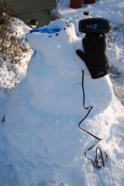 Funny how I just mentioned the hair dryer as a source of vulnerability for the so-called “Invincible Snowman.” Turns out my buddy Lee made a snowman, “Wheezy Joe,” who chose this method to end his own frosty life.