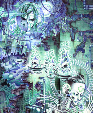 I get inspired by the industrial world, all the rigidity of machinery, the network of pipes, wires, refineries, etc. Then I join that with an opposite of flowing graceful, harmonious, and pleasing design of the Baroque and Rococo. And of course I add a bit weirdness and the macabre.