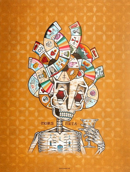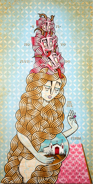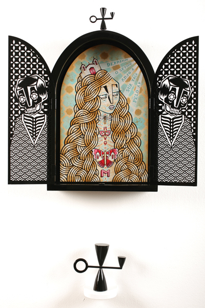 Sculptural works are wonderfully intricate constructions of pop culture effluvia like plastic model kits, injection molded toys, dolls, plastic skulls, knick-knack figurines, miniature fencing, toy animals, mechanical parts and ornate frames or furniture parts; assembled into grotesque tableaux that look a bit like an explosion in Hieronymus Bosch’s attic.