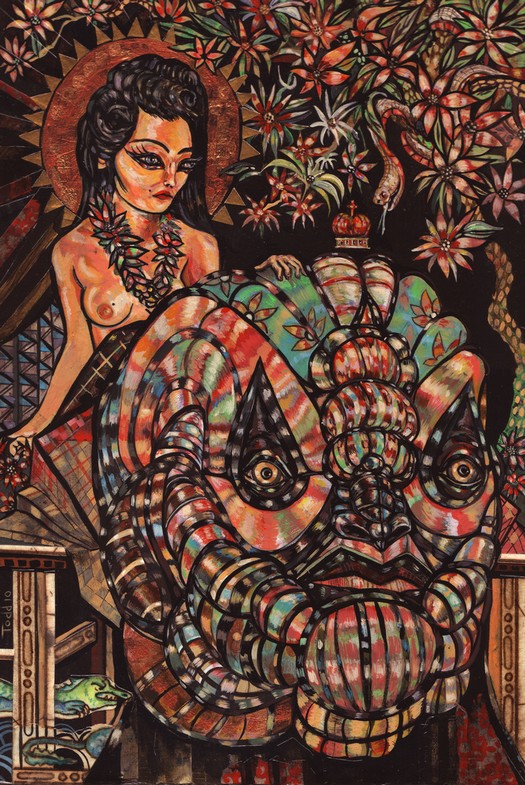 His many influences include tattoo graphics, street art, Asian, Northern European and Mexican cultures. By absorbing each of these influences into his art, Todd works with a number of different themes, processes and stylization’s in each piece.