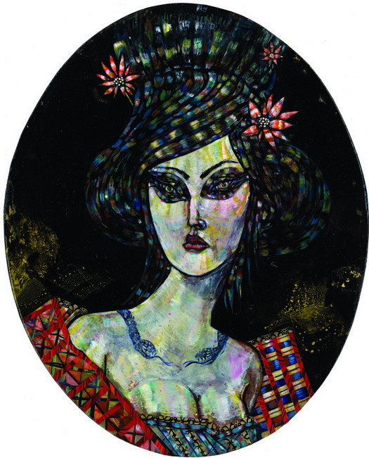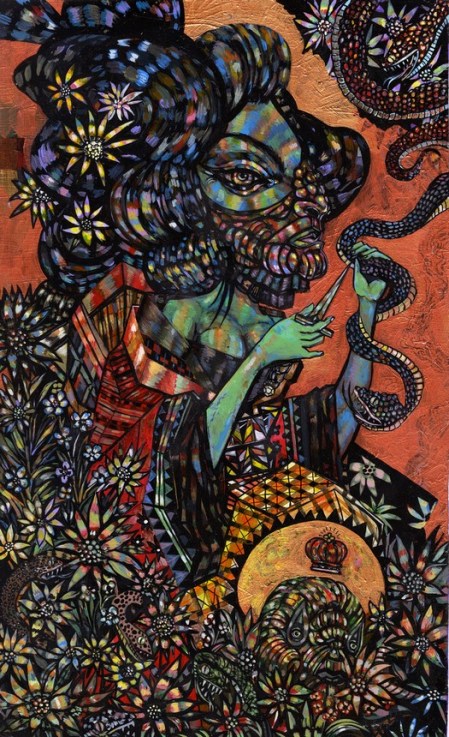 While exploring themes of war, corruption, and internal struggle, Todd uses as many mediums as possible as a part of his creative process. These include painting on found objects, collaging various patterned paper using the technique of alcohol transfers, wood block cuts and screen printing.