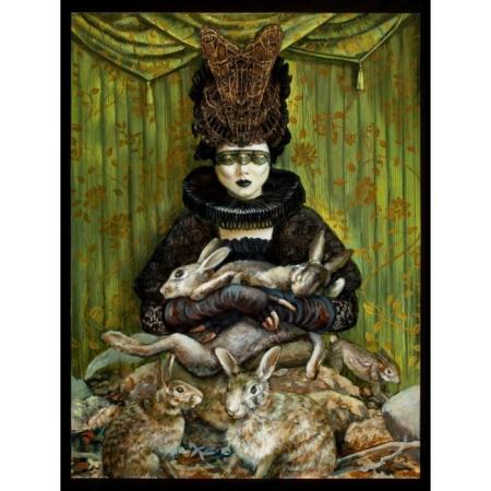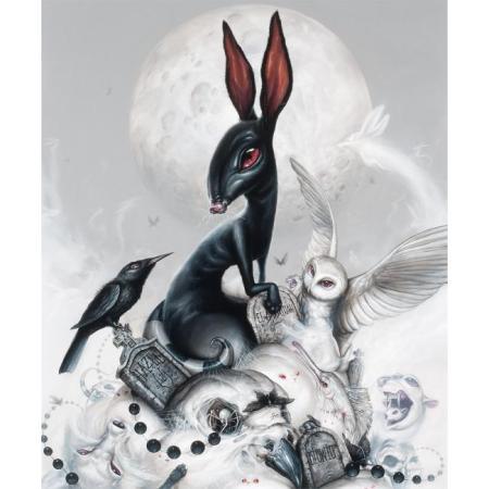 Some paintings represent the Black Rabbit of Inle, while others represent characters from the story.