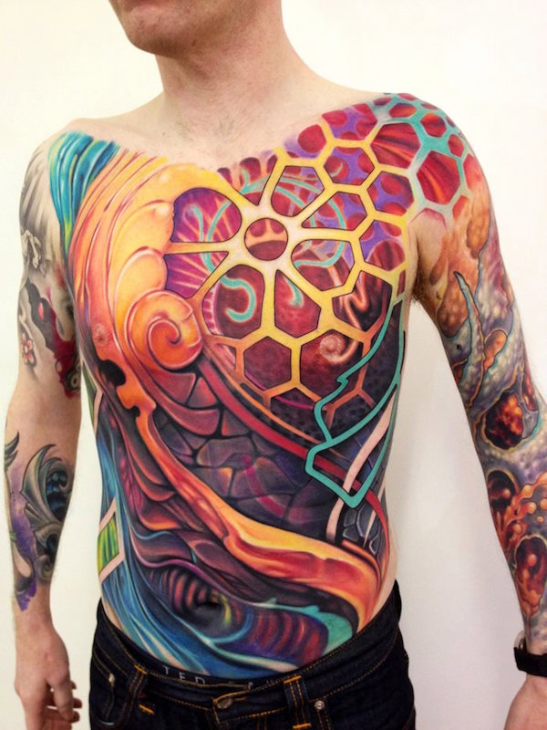 I’ve seen a number of gear, machinery and various android stylings in tattoo art, but perhaps none so unique as this brightly colored gem from Bez at Triplesix Studios: