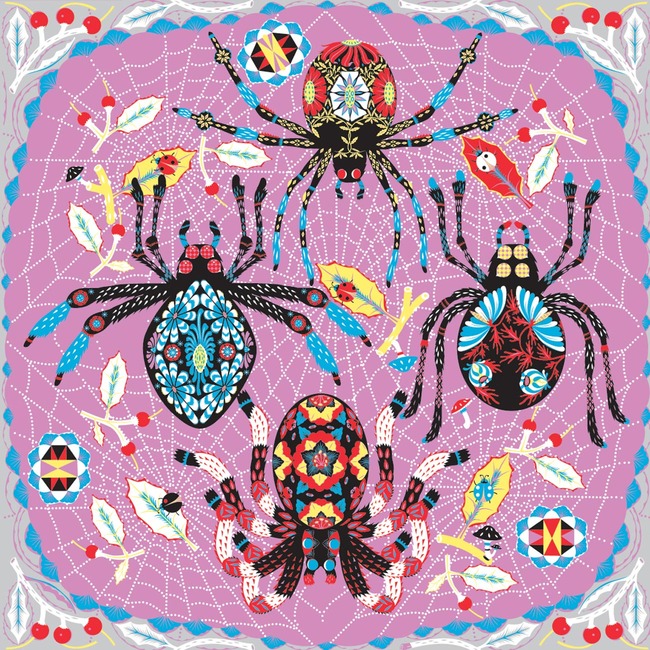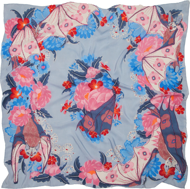 If you hadn’t guessed, I’m not a huge wearer of bright colors (it happens, but it’s usually somehow layered with dark things)…however, these bat & flower silk scarves by Klaus Haapaniemi are wonderful: