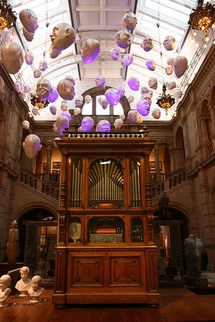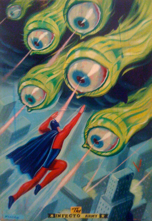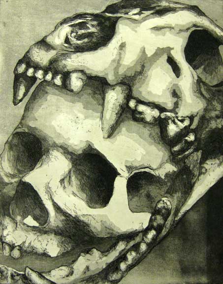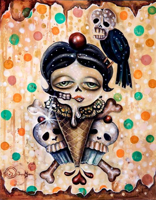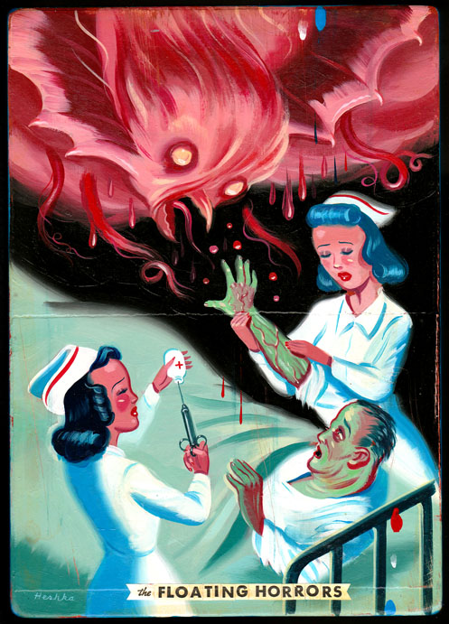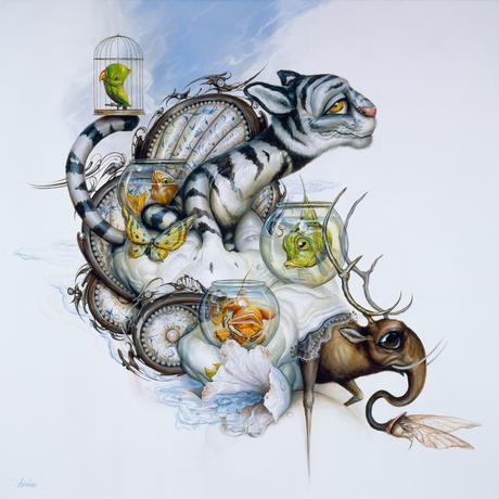 Simkins alternates between the unsettling and the sentimental—in his finely rendered work, the grotesque can turn sweet and vice versa. Fanged caterpillars become sad-eyed clowns, grow machine parts, or inflate into bulbous balloons that sprout other bizarre creatures and beings. Simkins’ vision weaves together influences as diverse as contemporary pop culture, twentieth- entury fantasy novels, old master paintings, carnival kitsch, and cyborgian amalgams of technology and nature.
