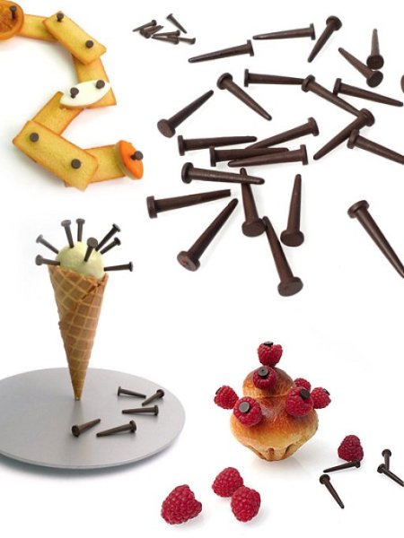 These chocolate nails by Stephane Bureaux should be mass produced for all dessert construction and decorative needs.