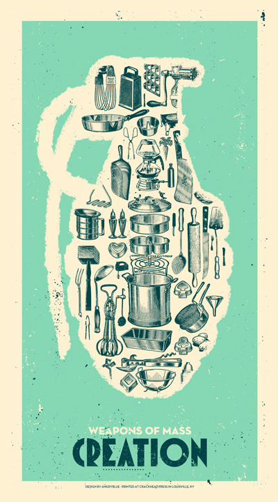 What a nifty little poster concept: Weapons of Mass Creation. Available in music, cooking and art supplies.