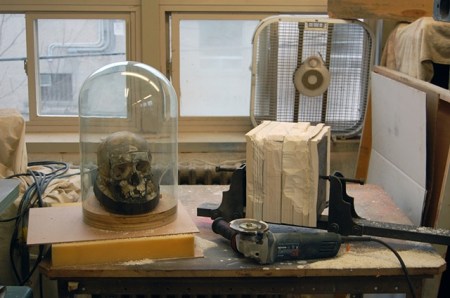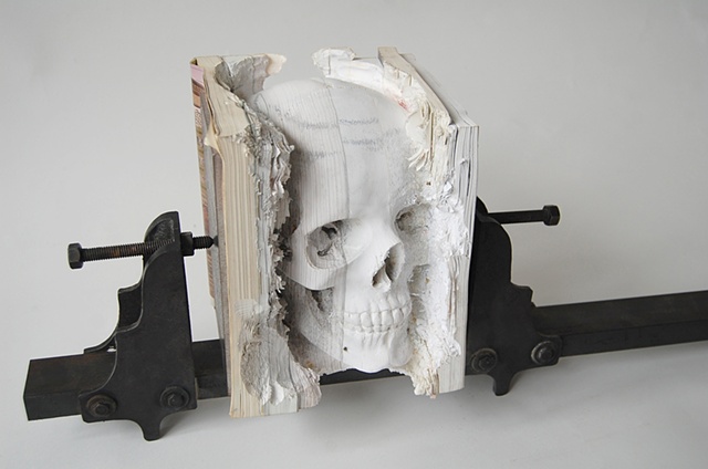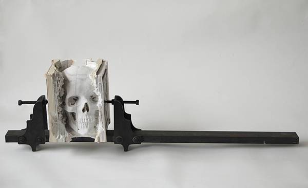 Maskull Lasserre carved a beautiful skull from obsolete computer manuals.