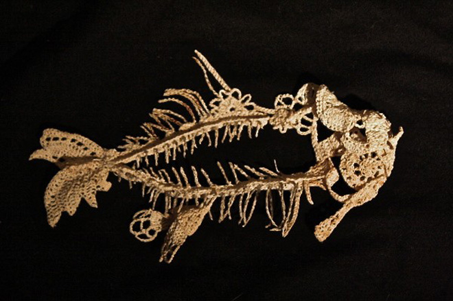 Some appear to me made from vintage doilies. Such an unlikely craft material for this subject matter, and I think it works.
