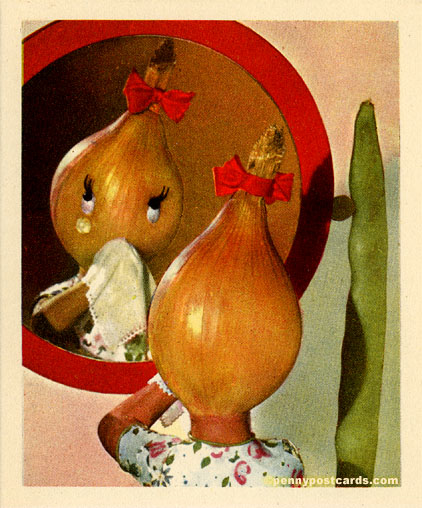 A vintage depiction of an onion bringing HERSELF to tears. How meta.