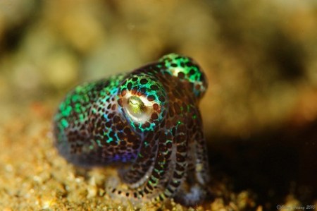 Bobtail squid have a symbiotic relationship with bioluminescent bacteria (Vibrio fischeri), which inhabit a special light organ in the squid’s mantle. The bacteria are fed a sugar and amino acid solution by the squid and in return hide the squid’s silhouette when viewed from below by matching the amount of light hitting the top of the mantle. The organ contains filters which may alter the wavelength of luminescence closer to that of downwelling moonlight and starlight; a lens with biochemical similarities to the squid’s eye to diffuse the bacterial luminescence; and a reflector which directs the light ventrally.