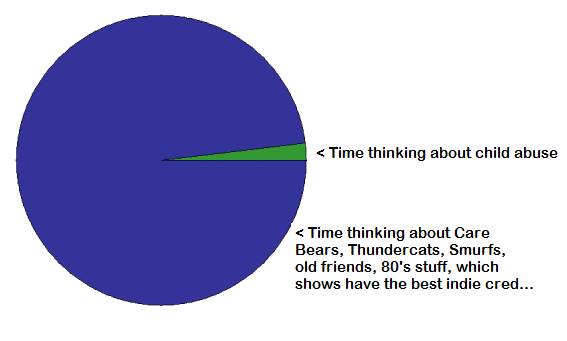 Sadly, I’d wager that upon the spread of the cartoon character meme, most people briefly thought “Yes, child abuse is wrong.”…and then spent half an hour googling the perfect ironically retro cartoon image to post, enraptured in their own nostalgia. I’ve seen plenty of “Dude, I loved Thundercats!,” but ZERO comments about child abuse itself.