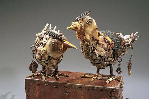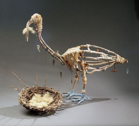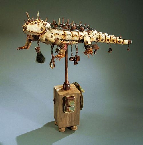 Assemblage artist Jocelyn Marsh has some fine found object sculptures made of bones and bits of gaudy delight.