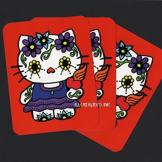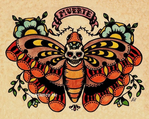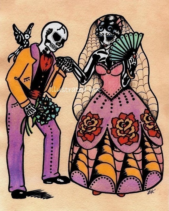 The prints have a distinct tattoo art feeling to them, while incorporating Day of the Dead subject matter.